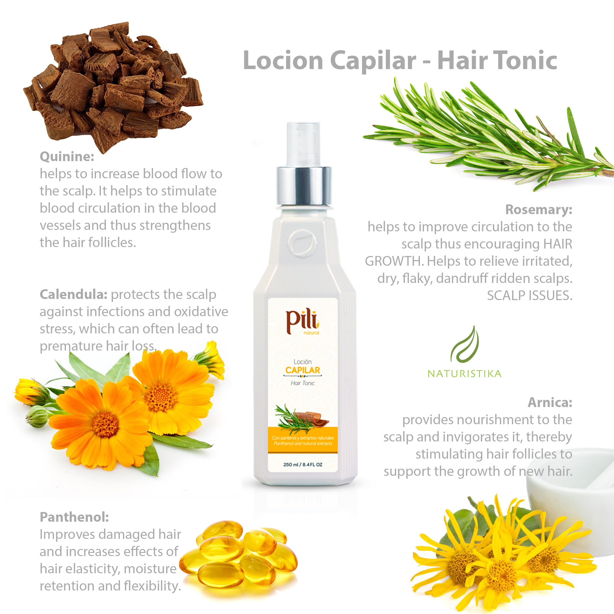 Pili Natural Hair Tonic contains panthenol, rosemary, quinine, arnica and calendula extracts that help to strengthen and nourish the hair follicles preventing hair loss and stimulating hair growth